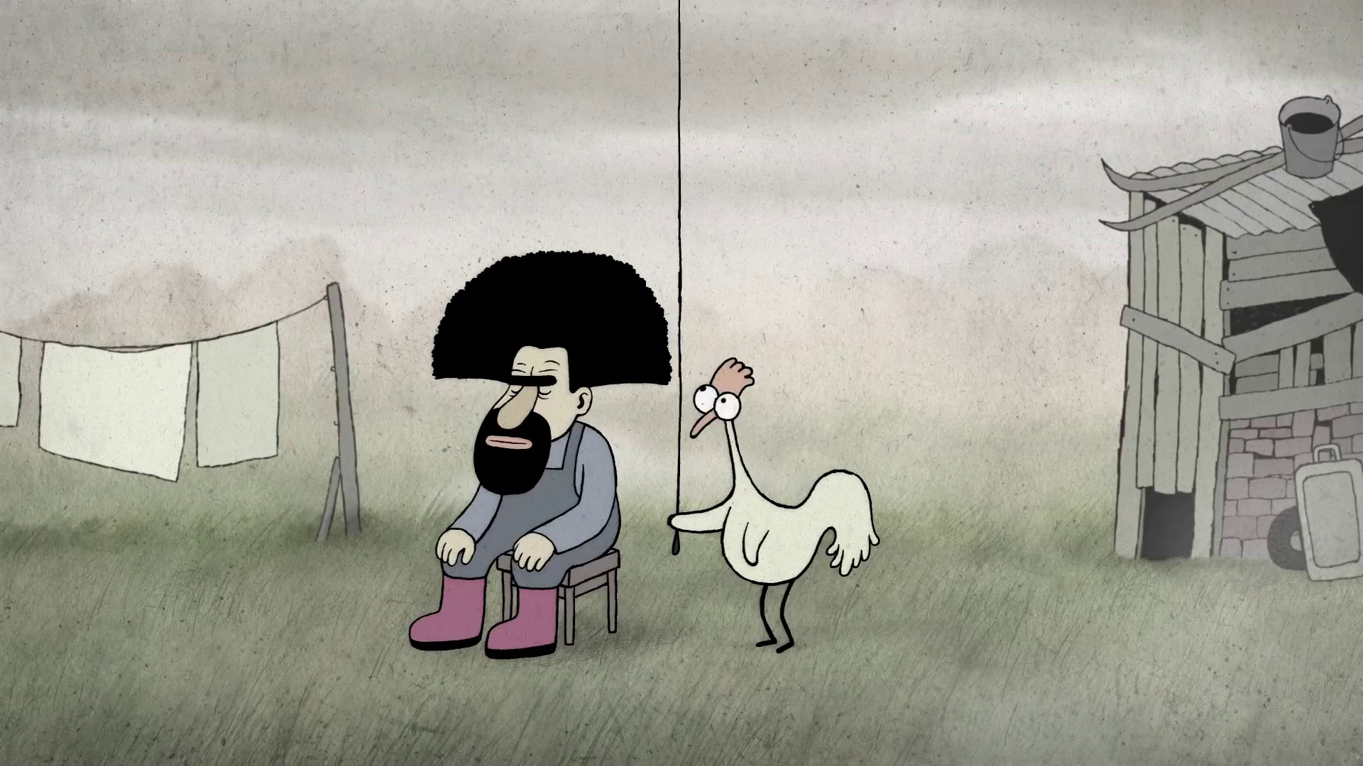 Всякий раз, когда пернатый герой дёргал за веревку, происходило нечто неожиданное. То с неба свалился огромный колобок, чуть не пришибивший спящего хозяина, то у этого самого хозяина отвалилась борода, то выросла густая копна волос. Петуха-недотёпу всё это не остановило. Он продолжал дёргать за верёвочку – на этот раз его собственный хвост убежал от него. Ещё один манёвр – из озера появилась статная пловчиха и уютно устроилась за столом под деревом. Птица всё продолжала и продолжала дёргать за верёвку, пока, наконец, не проснулся хозяин. Стоило ему сбросить с себя негу, как начался сильный дождь. Петух деловито стал искать место, чтобы укрыться от непогоды вместе с курами. На глаза ему попался брошенный автомобиль, в котором их уже ждали хозяин и пловчиха.